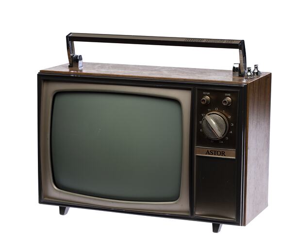 Astor transistorised television receiver "Solid State 12" with 12 inch screen. Monochrome. Wood grained veneer on metal cabinet, with carrying handle and telescopic antenna. Made by Radio Corporation, a division of Electronic Industries. About 1957.