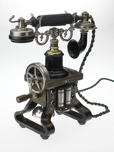 Consists of heavy iron frame on legs with bells underneath the hammer of which is operated by a current from the magneto electromagnets. The iron frame is painted black with gold decorative elements. On top is a two forked support for the combined receiver and transmitter. There is a long green textile cord from the transmitter to the iron frame and from the frame to a brown plastic plug.
