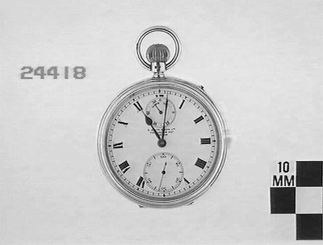 Back plate is marked 'S. Smith & Son Ltd, Trafalgar Square London, Watch & Chronometer Maker to the Admiralty & Indian Government. 238-108'. Dial is marked 'S. Smith & Son Ltd. Trafalgar Sqe. London'. Case is stamped 'JR' and is marked with a crown and 18 and has a London hallmark for 1869 (uncrowned leopard and small o with straight sides).
