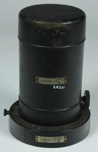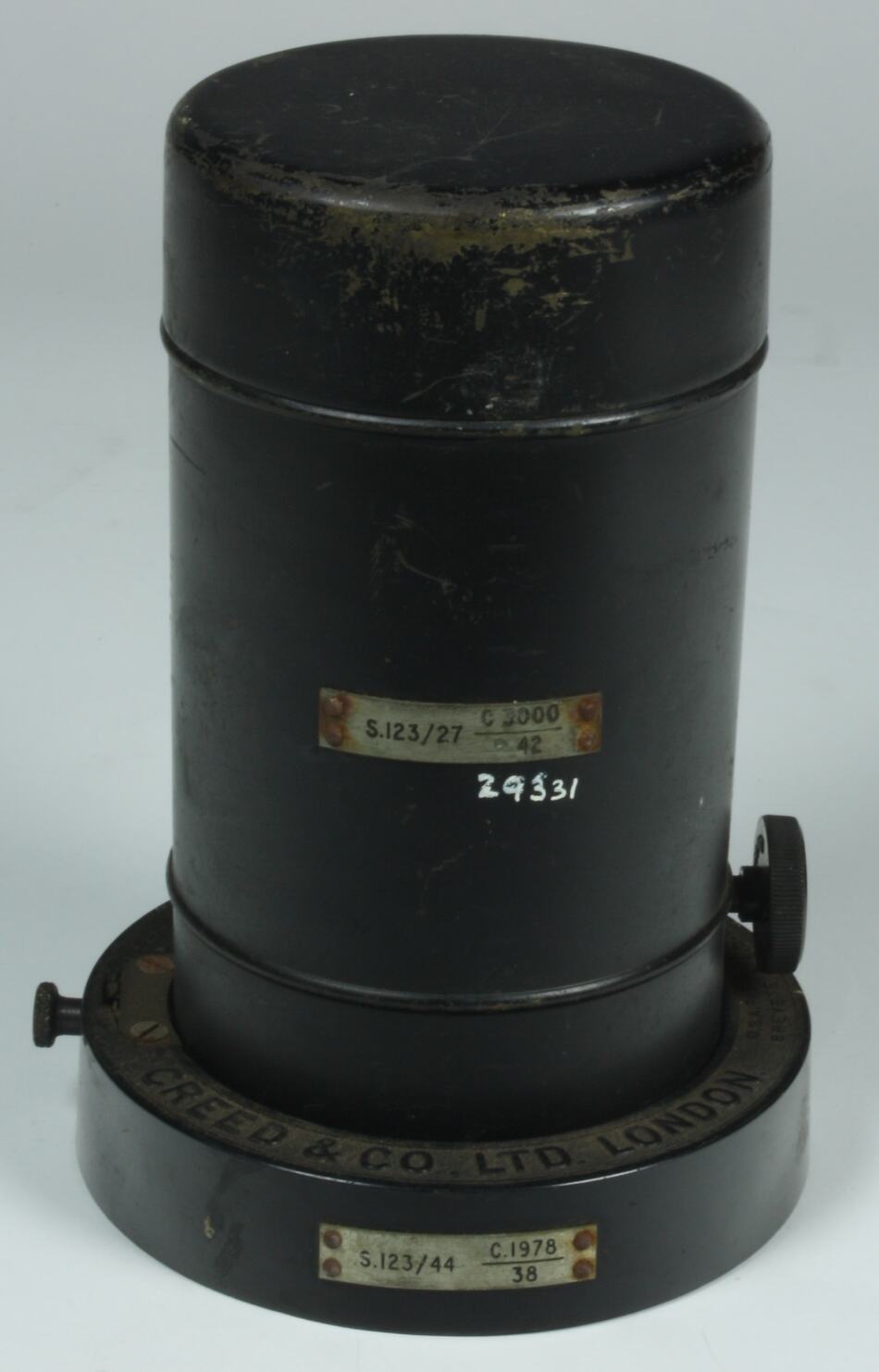 Top of circular base embossed: "CREED & Co, LTD LONDON TYPE1927 RELAY" and: "U.S.A. PAT. 1552676 BREVETTE S.G.D.G." Underside of base embossed: "MADE IN ENGLAND" Plate on side of cylindrical case engraved: "S123/27 C3000/38" Plate on side of base engraved: "S123/27 C3000/42"
