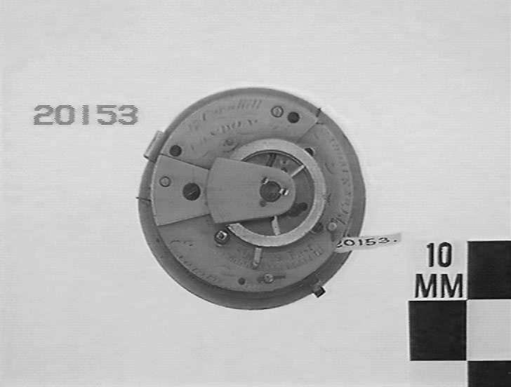 One of several watch movements donated by Ingram Brothers jewelers in 1937. During the 1930s Depression, customers would bring in gold or silver fob watches to sell for the value of the gold or silver. Ingrams (and other jewelers) melted down the cases to sell the metal, but kept the movements of historically interesting watches.