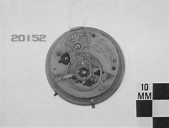 One of several watch movements donated by Ingram Brothers jewelers in 1937. During the 1930s Depression, customers would bring in gold or silver fob watches to sell for the value of the gold or silver. Ingrams (and other jewelers) melted down the cases to sell the metal, but kept the movements of historically interesting watches.