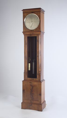Eight day long-case astronomical regulator clock, by Charles Frodsham, London, No. 1062, 1865. Weight driven, with dead-beat escapement and mercury compensation pendulum. Used at Melbourne Observatory from 1865 until the Observatory closed in 1944.