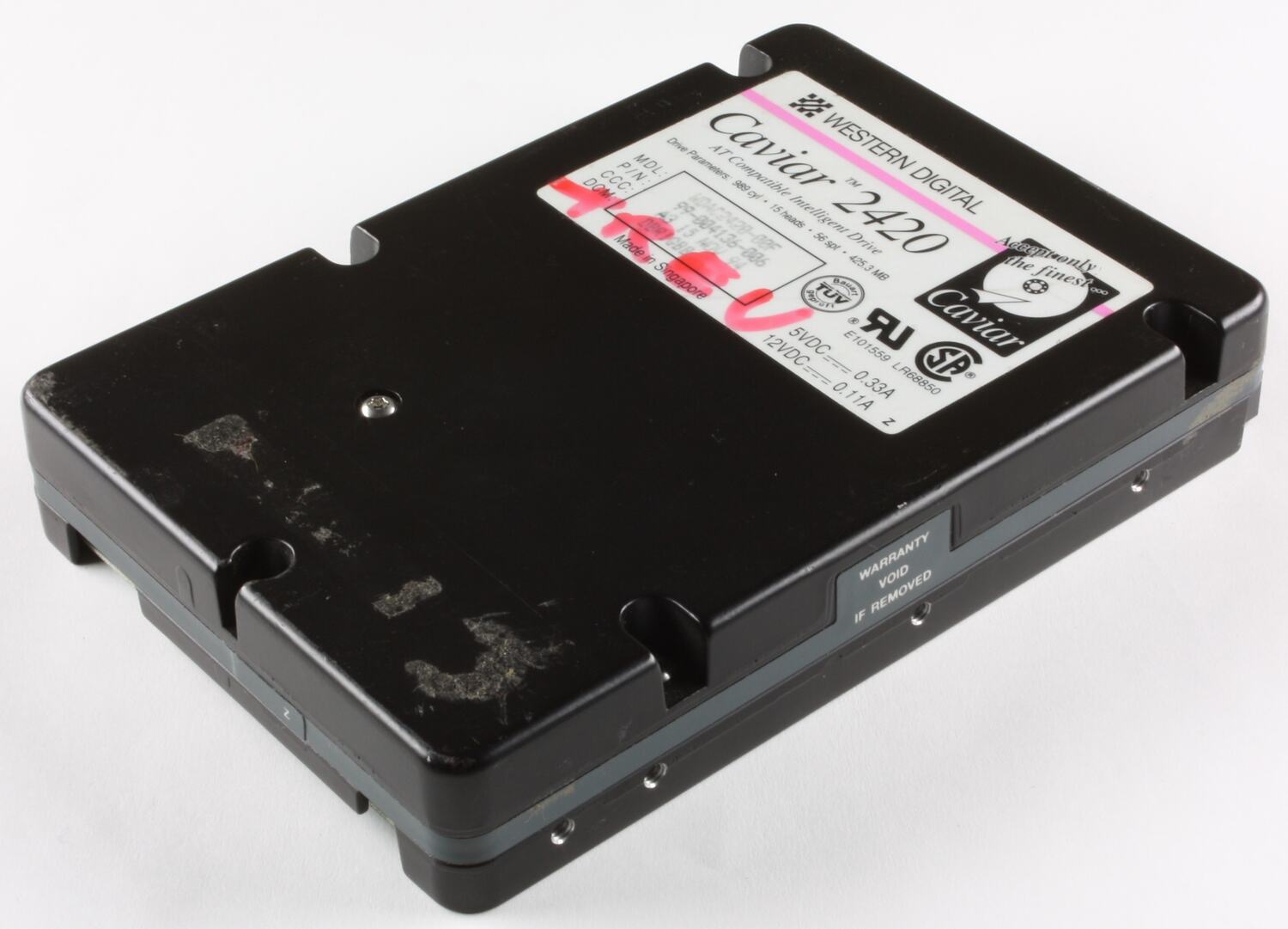 Caviar 2420 AT compatible intelligent drive, made by Western Digital. Made in Singapore, probably on 15th November 1994. Parameters- 989 cyl, 15 heads, 56spt and 425.3 MB. Integrated circuit