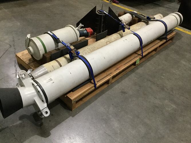 The Museum's Gosling rocket motor was donated in 1994. It is fitted with an angled nozzle characteristic of the motors used on the Bristol Bloodhound missile. Those used on the HAD rockets were fitted with a straight nozzle. It is painted white with a single green band near the top of the outer casing. The Bloodhound was used by the RAAF between 1961 and 1968 by 30 Squadron at Williamtown, NSW with a detachment at Darwin between 1965 and 1968.