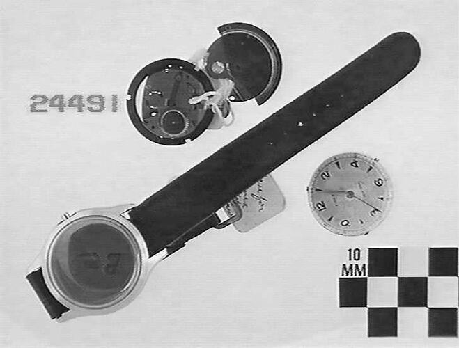White dial has outer ring of arabic numerals for minutes and inner hour ring of silver arabic numerals for even numbers and silver arrows for odd numbers. Self-winding spring; lever escapement.
