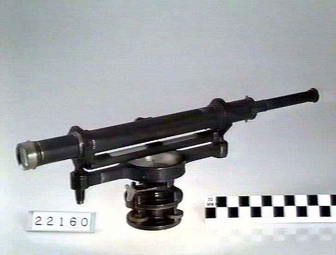 Wye level, by Troughton & Simms, London. Telescope has a rack-focussing objective of 1.5 inch aperture. Used at Melbourne Observatory.