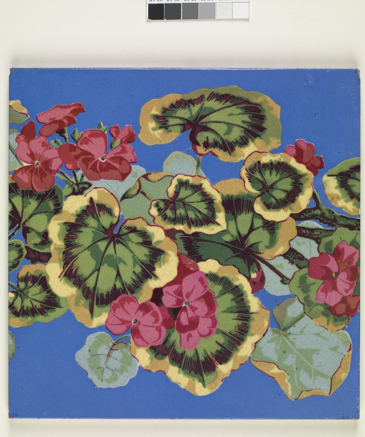 Earthenware tile, with blue underglaze, printed with a design of Geraniums in green, yellow, pink and red.