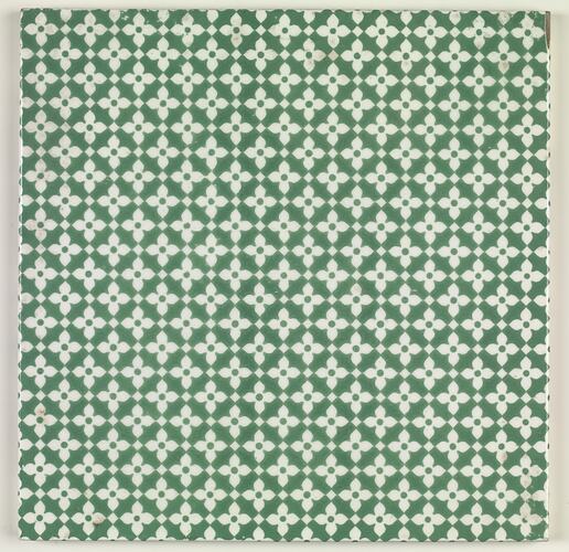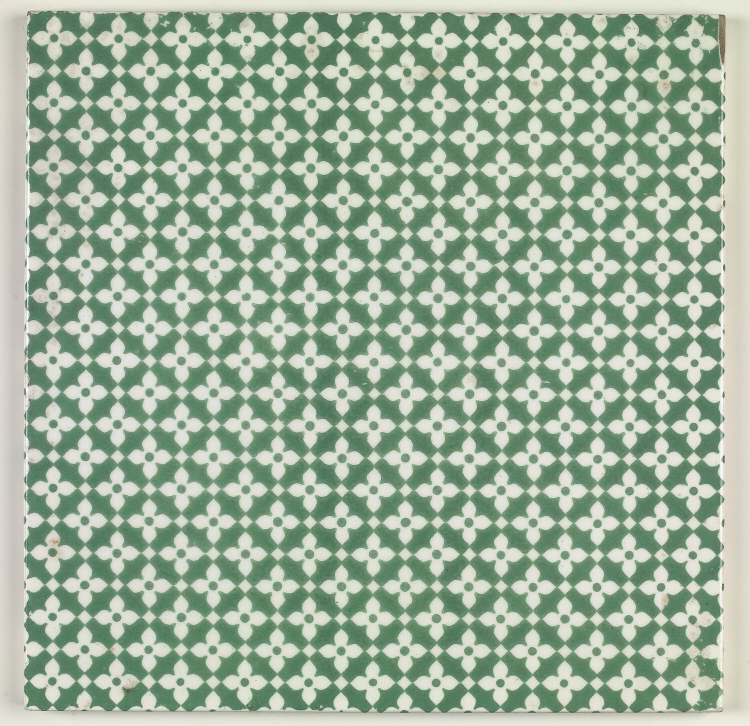 This tile has a printed geometrical design, of white stars and diamonds, on a bright green background.