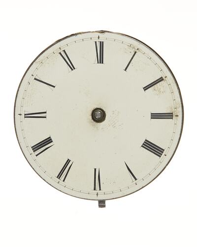 White enamel dial has roman numerals. Key wound spring; verge escapement. Fusee and chain.