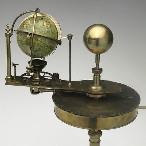 Brass circular mechanism 17cm diameter supported on base with 3 folding legs. Plate also has concentric circles near edge showing date & signs of zodiac. Centrally above mechanism is brass ball representing sun. Tellurium or lunarium can be fitted onto axis below sun. At later date a brass circle was added to globe to show longitude. Also a semi-circle on n-s line to show latitude. Howver, this interfered with operation so has been removed and is stored in Orrery's box.