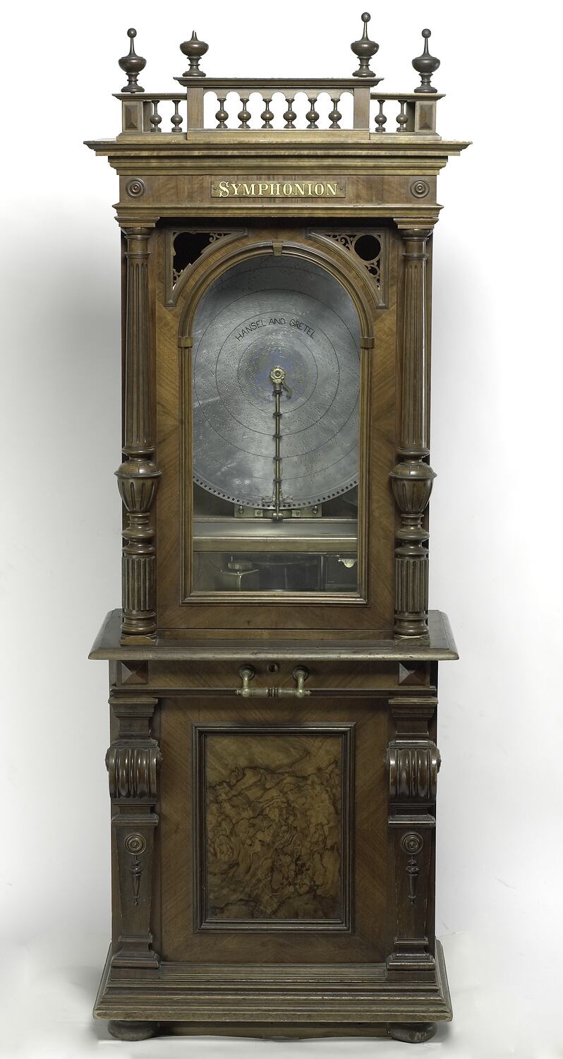 Clockwork mechanical musical box for playing 25 1/4 inch (641 mm) diameter perforated metal discs. This type of instrument was developed by Paul Lochman of Leipzig, Germany, in 1885, and may be regarded as a forerunner of the juke-box. The symphonion and other mechanical music boxes were very popular in Europe and North America in the late 19th and early 20th centuries.