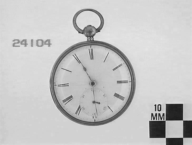 Silver case, open face. White enamel dial has roman numerals and seconds hand at 6. Key wound spring wound; cylinder escapement. Fusee and chain.