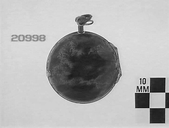 Tortoise shell and gold pair case. Tortoise shell case is patterned. Outer case is lined with newspaper. White enamel dial has black arabic numerals. Back plate has ornate foliage design Key wound spring; verge escapement. Fusee and chain. Winding dial.