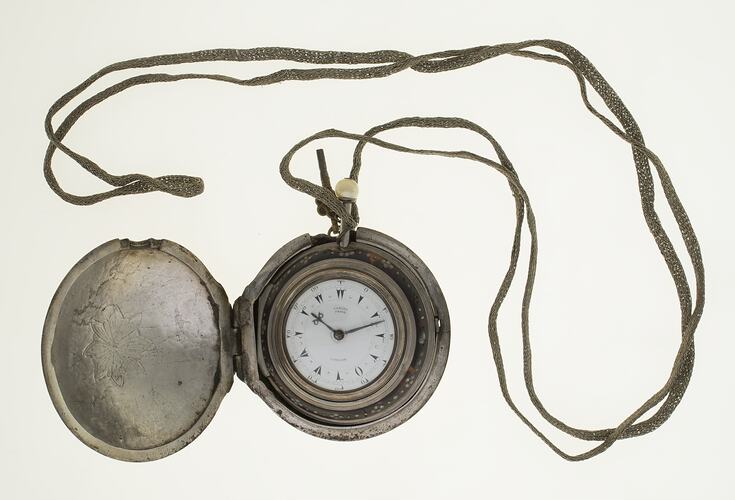 Three outer cases. First case is plain silver with engraved foliage in form of 8 pointed star. Second case is silver and tortoise shell. Third case is silver with London hallmark for 1814. Silver inner case has 1816 London hallmark. Long stem terminates in a pearl. Long silver plaited chain is attached. White enamel dial has two circles of Turkish numerals. Inner ring for hours 1 to 12, outer for minutes 5 to 60. Key wound spring; verge escapement. Fusee and chain.