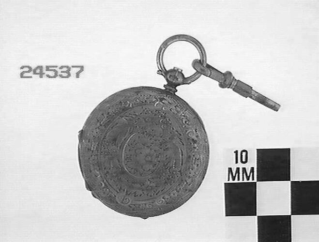 Silver hunter case engraved all over with foliage design. White enamel dial has black roman numerals. Key wound spring; cylinder escapement. Key with watch.