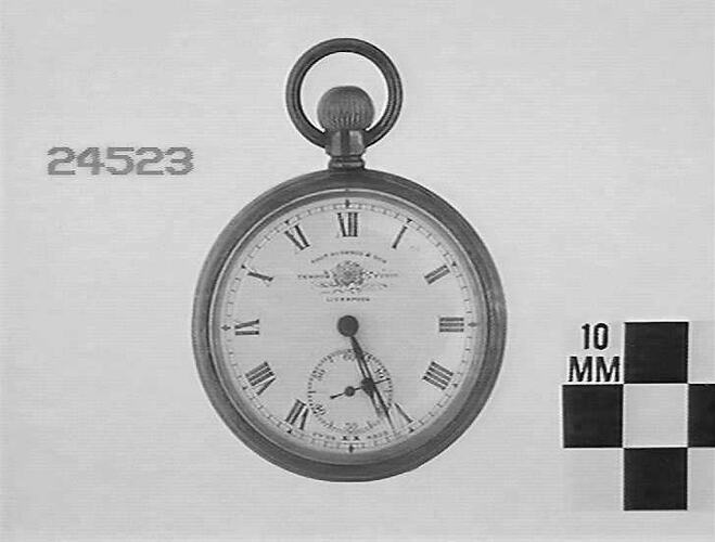 Movement is marked '49851', '10 jewels' and 'Swiss Made'. One wheel is marked 'Thos Russell & Son, Liverpool'. Inside of back case is marked 'Electro Gilt Case' and '0619170'. Dial is marked 'Thos Russell & Son, Liverpool', 'Tempus Fugit' and 'Swiss Made'.