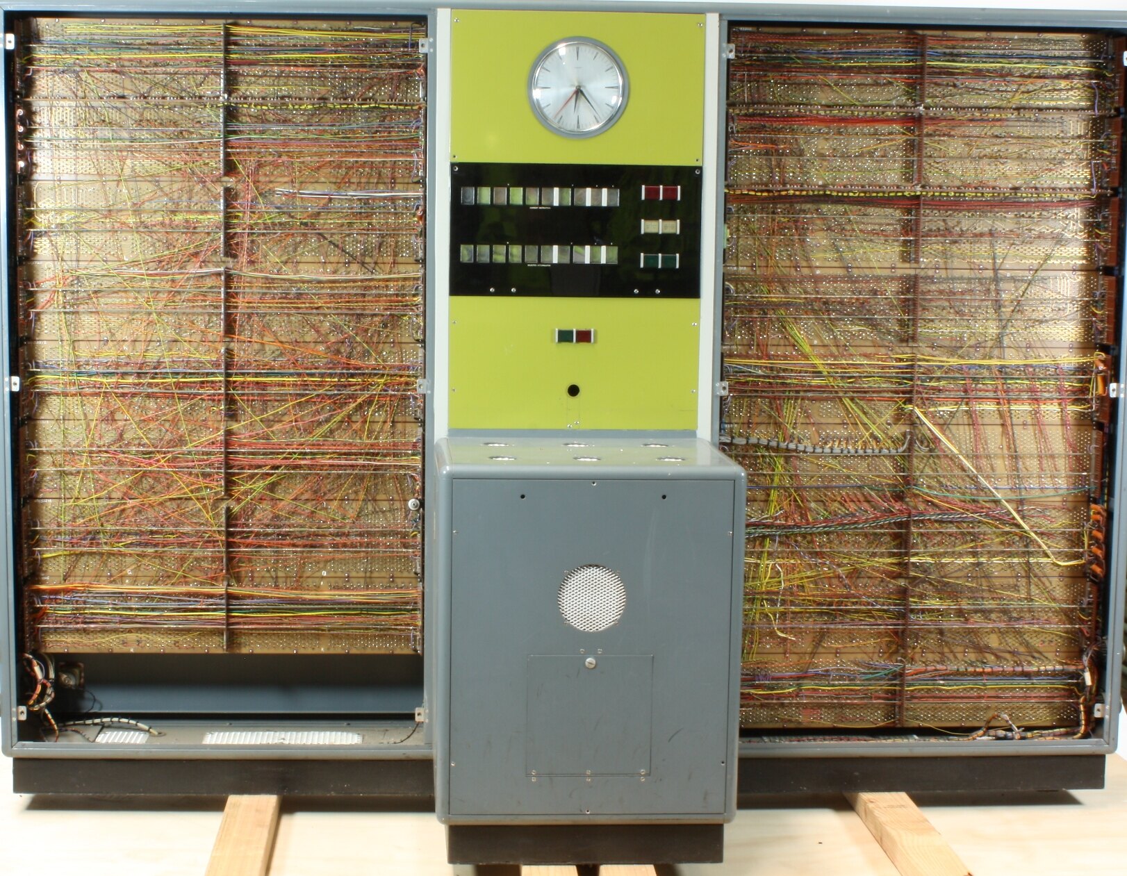 The computer system is not complete; the following items are in the Museum's collection: 1. Central processor: large greyish metal cabinet, made up of three sections with a smaller box in front of the centre section. A clock and a set of control lights are set into the front face of the centre cabiney. 2. Two memory units: each is a featureless shiny grey metal cabinet. Uunits contain banks of memory modules and circuitry. 3. Tape edit set: shiny grey metal desk unit with tapered front edge, on which is set a small control pane 4. Tape reader 5. Tape punch: rectangular shiny grey metal box with hinged lid, which, when lifted, reveals the paper tape punch mechanism 6. Keyboard: Roughly rectangular shiny grey metal box with gently sloping mainly numeric keyboard. 7. Current probe, lamp extractor, circuit board and connecting cable. There are over 45 rolls of punched paper tape carrying data and programmes. Reference and other material includes: manuals, booklets, documents, log books, print-outs, drawings and diagrams, and videos.