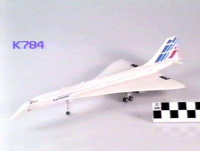 This scale model represents an Air France Concorde F-BVFA, the first Concorde to enter service with Air France. In June 2003 it was flown from France to Washington Dulles International Airport, USA where it was presented to the US National Air & Space Museum.