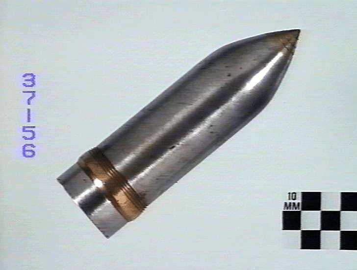 Shell, 18 pr (pounder). Projectile 5 3/4 in. (146 mm) long, 1 5/8 in (41 mm) diameter, single driving band, brass fuze in nose.