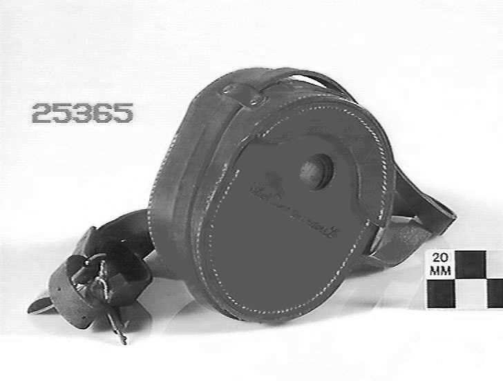 Metal case inside leather case with straps, and hole to show round glass aperture in front of rotating ring dial. Spring wound.