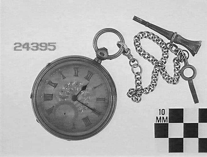 Silver case, open face. Silver dial has gold roman numerals and seconds dial at 6. Centre of dial decorated with engraved spray and appliqued gold flowers. Key wound spring; lever escapement. Fusee and chain.