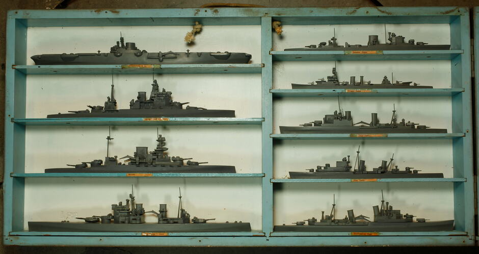 Set of 18 waterline models of British and Commonwealth naval ships. These sets were made by Renown in Britain and H.A Framburg of Chicago, USA. Used for ship recognition training during World War II. Folding case is dated '12.4.1943'.