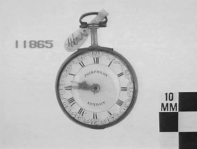 Back plate is marked 'Josephson, London, 1634'. Dial is marked 'Josephson' and 'London'. Inner case is hinged, has date mark 1787/1788 and is marked '1634'.