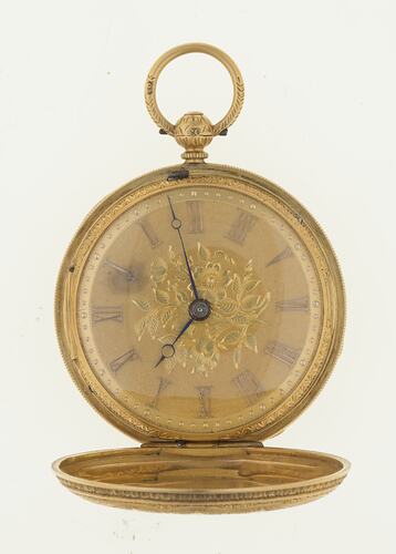 Woman's pocket watch, gold hunter case, Rotherhams, London, 1865.