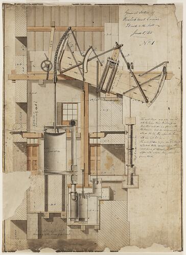 Hand-coloured ink and watercolour drawing showing a general cross-section of an atmospheric condensing beam pumping engine designed by James Watt and supplied by the firm Bolton & Watt, of Birmingham, to the Margaret Mine, at Wanlockhead, Dumfries, Scotland, in 1785-86. Scale: 1/3 inch to 1 foot. The drawing is part of a set of technical drawings supplied by the manufacturers showing general arrangements, details of foundations and key components for a 55-inch (1397 mm) bore x 8 foot (2438 mm) stroke single-acting single-cylinder steam pumping engine ordered for the Margaret Mine by Gilbert Meason, general manager of the Wanlockhead Mining Company, in June 1785. Labelled as sheet No.1, it shows a longitudinal cross-sectional elevation through the three-storey engine house and key components of the engine including the steam cylinder and condenser. The drawing is believed to have been executed by James Watt, or an assistant working under his direction, and includes a number of annotations written in blue ink in what appears to be Watt's hand, giving selected dimensions of the general assembly and other notes to the erectors.