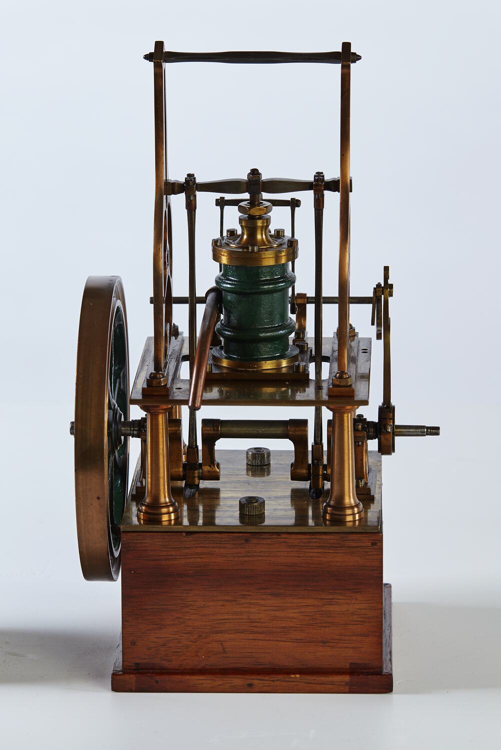 Non-condensing (high-pressure) table type steam engine model. Approx 30 mm bore x 44 mm stroke. Eight straight-spoked flywheel, 147 diameter with 14 mm wide x 14 mm thick rim. Design patented by the English engineer Henry Maudsley in 1807. Model, in brass. Model made by A.E. Smith, a former Chief Mechanical Engineer with the Victorian Railways.