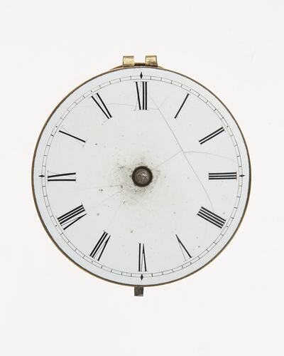 White dial has roman numerals. Detachable back cover is cut away to show winding dial. Key wound spring; verge escapement. Fusee and chain.