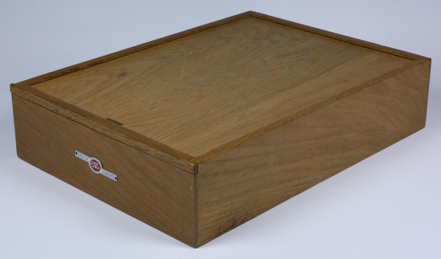 Wooden box end panel: GRIFFIN <logo> CLARKESMITH Wooden box lid: MADE IN ENGLAND Instruction sheet: CATALOGUE No. L97-100 / INSTRUCTION SHEET / No. 1083 // 6001 / GRIFFIN - CLARKESMITH / MECHTRONICS SET / <logo> / GRIFFIN & GEORGE (SALES) LIMITED / The Laboratory Furnishers / LONDON BIRMINHAM MANCHESTER GLASGOW EDINBURGH / Head Office: Ealing Road, Alperton, Wembley, Middlesex / Telephone: PERivale 3344 Telex: 21126