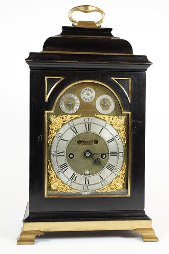 Black wooden frame with glass doors and sides, brass handle at top and gilt feet. Dial has white metal chapter ring. Clock has gilt cherubs in spandrels. Two dials in arch: left dial chimes, right is strike or silent. Spring wound; verge escapement. Dummy pendulum, up down regulator, 2 fusees and repeater and date chapter ring. Adjust speed by shifting hand on upper left dial; clockwise to gain. List of Parts: Case key and winding key.