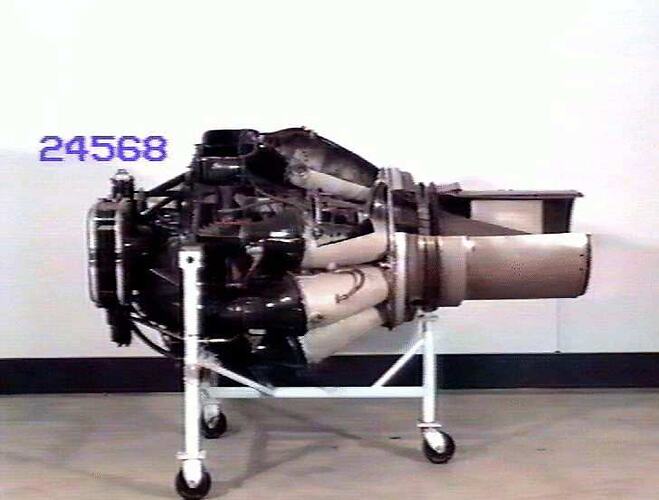 The Museum's Derwent engine (serial no. 6358/A626863) was delivered direct from the UK to No. 91 (Composite) Wing RAAF at Iwakuni, Japan on 27 March 1951. The engine was already installed in the starboard nacelle of Meteor A77-587 when it arrived on the aircraft carrier HMS Warrior. It was de-inhibited for flying service on 3 May 1951. A test run of 1 hour, 25 minutes on 9 May was satisfactory but on 11 May a turbine blade failed during a ground run which bent all the other turbine blades and damaged the shroud ring. It was removed from the aircraft and returned to Australia for repair at No. 1 Air Depot, Laverton in Victoria. Repairs were carried out in November 1952. A test run at 1 AD on 18 December 1952 was not satisfactory as the jet pipe temperature was excessive, the fuel pump leaked as did the outer oil casings. The engine was completely dismantled and taken to Aeronautical Research Laboratories and Commonwealth Aircraft Corporation at Fishermans Bend for full proof testing in July 1953. After passing tests for endurance and power curve, the engine was returned to store. It returned to No. 77 Squadron in February 1955, based at Williamtown NSW. It was installed in the port nacelle of Meteor Mk.8 A77-880 on 6 May 1955. It remained with this aircraft until 1 March 1956 when it was removed and returned to store with No. 2 AD at Richmond, NSW. It was then fitted to the port nacelle of Meteor A77-884 on 21 March 1957. It remained with the aircraft until 29 July 1958 when it was removed. The engine was sent to No. 1 AD Laverton on 5 December 1958 for storage. On 19 November 1959 it was transfered to the Museum along with its log book. It was apparently sectioned for display by the RAAF before it arrived at the Museum.