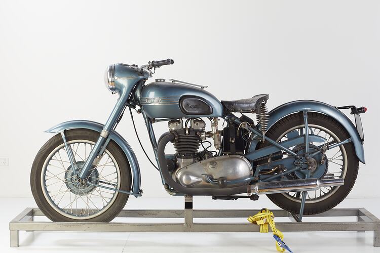 The Thunderbird was used by Victoria Police in solo and sidecar form during the 1950s for traffic duties but it is perhaps best remembered for being ridden by Marlon Brando in the 1953 film 'The Wild One'. The original Thunderbird was produced until 1965 at the Meriden Works of the Triumph Engineering Company Ltd, Allesley, Coventry, England. The Thunderbird name was later reintroduced by the new Triumph firm in 1995 and continued in production until 2003, emulating its namesake by achieving sales success in the USA. This example was donated to the Museum in 1982.