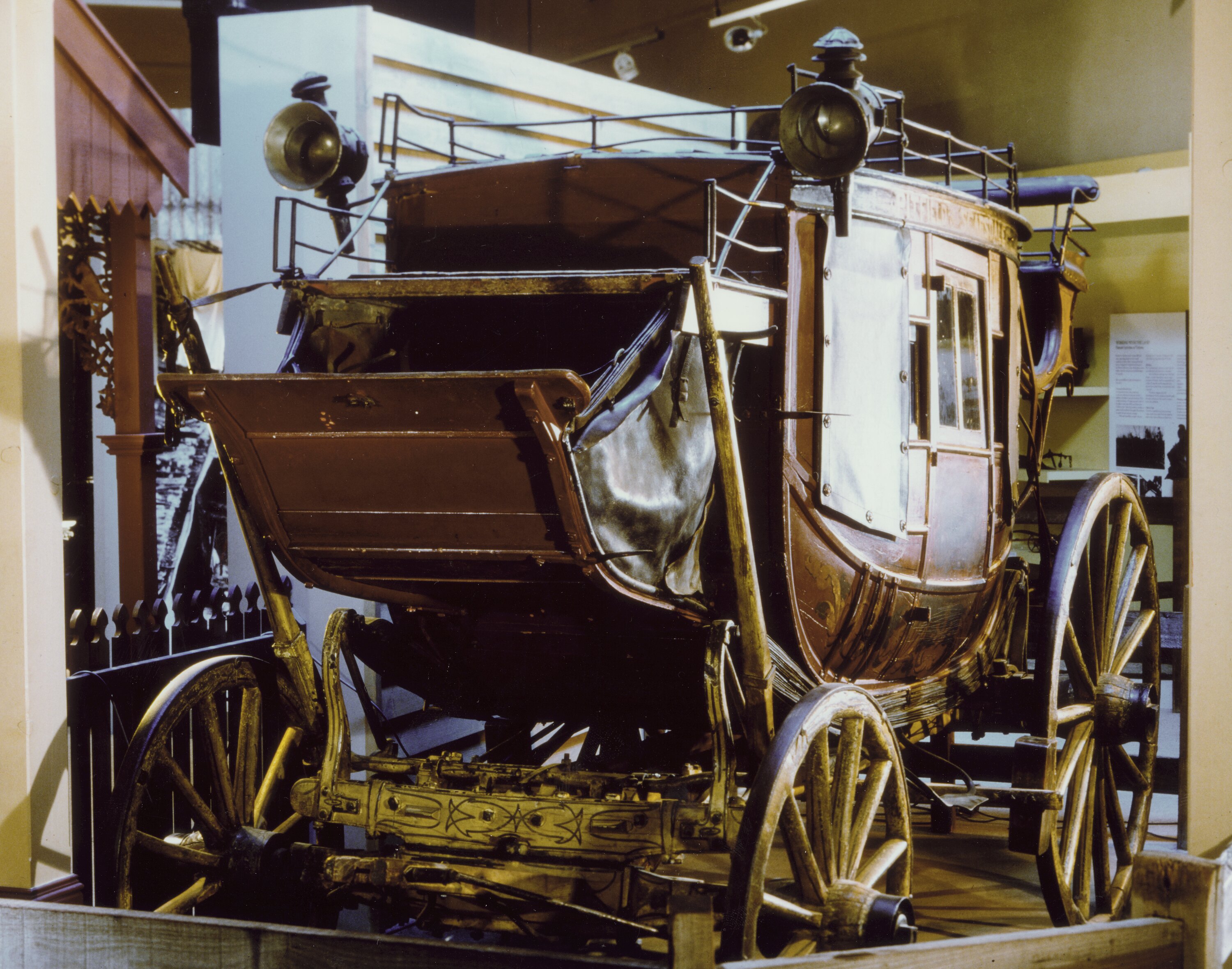 Richard Aisbett was born in 1837, in the village of Thornley, County Durham, England, and arrived in Victoria during the latter part of the goldrush decade. He married Jane Irvine at Ballarat in 1862 and they settled at Scarsdale where he inititally followed his father, Edward, into the mining profession, before turning his hard to carting. His father was tragically killed in an underground mining accident in 1868, leaving Richard in part responsible for the welfare of a large extended family. In 1879 he established the Atlas Line of Coaches offering passenger services between the towns of Scarsdale, Newton and Ballarat, with additional routes to the outlying mining settlements of Kangaroo, Staffordshire Reef, Golden Lake, Piggoreet and Happy Valley to the south-west. In later years he operated a feeder service from Pitfield Plains and Berringa, meeting the train at Scarsdale or Newton Railway Stations, however, the direct service to Ballarat was also maintained in competition with the railway, at the fare of one shilling each way. Three of his sons, David Malcolm, Edward John and James worked for the business as coach drivers and by the 1900s were also involved in the management. After Richard's in 1911, they continued to operate the coaches under the name 'Aisbett Bros', until April 1916. Around 1899 or 1900, the Aisbett family bought several secondhand coaches from Vines & McPhee, including this original Abbott & Downing coach, according to a later account by James Aisbett. In 1925, the coach was bought to Melbourne by rail, to be displayed at the Motor Show in the Exhibition Building, and it returned again in August 1934 when it was donated to the Public Library and Museum on Swanston Street.