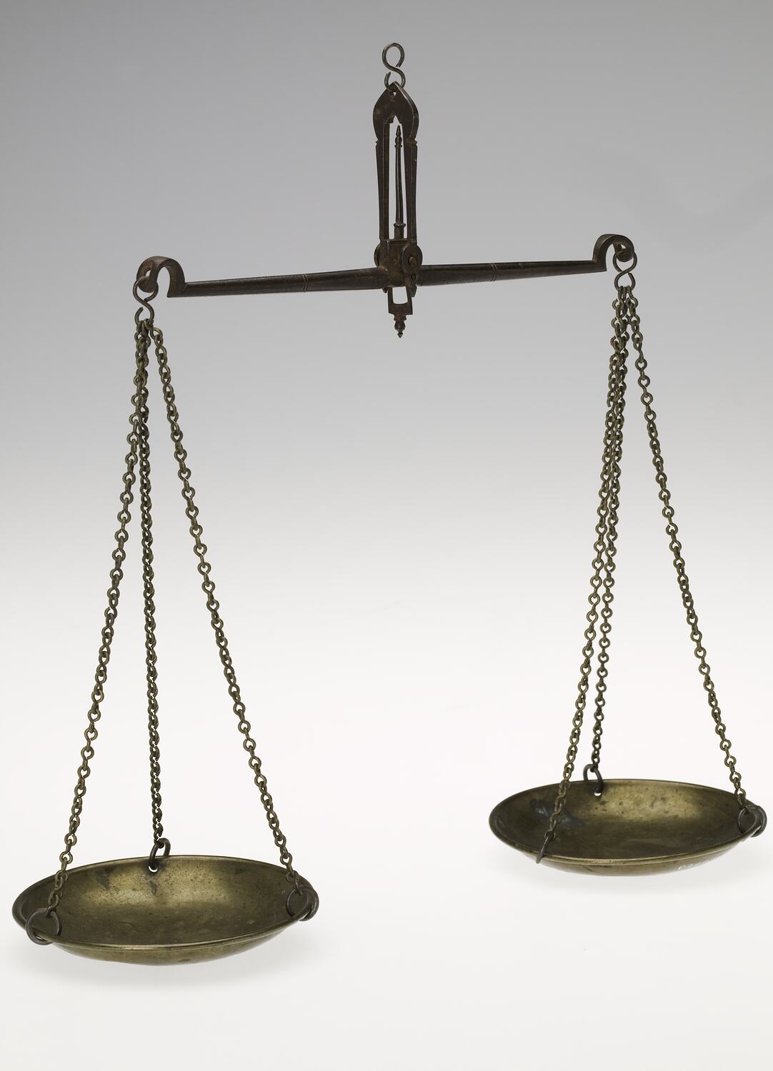 The scales have two brass pans each supported on three chains hanging from a steel beam. Pointer at top and bottom of fulcrum, with S shaped loop at top for hanging. They also have a set of nesting weights from 0.25oz to 4oz Troy and a set of fractional weights from 1 grain to 6 Pennyweights.