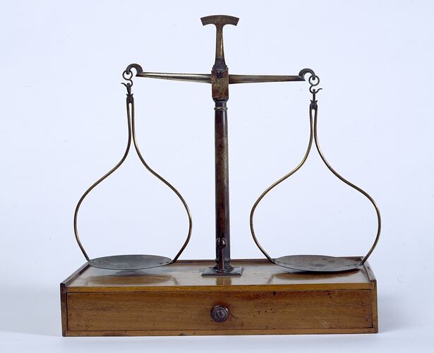 Two pan gold scales mounted on a wooden box, made circa 1850. They were used by the Denis Brothers to weight gold brought into their shop by miners from the Bendigo and Ballarat goldfields. The Denis Brothers established a watchmaker and jewellery shop in Melbourne in 1853.