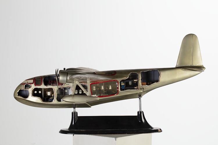 This large 'cut-away' model of S.23 C Class flying boat G-ADHL ' Canopus' was donated to the Museum by Qantas Empire Airways in 1950. It is believed to be an original promotional model built in the 1930s. It is similar to an example held in the Science Museum, London which was built in 1936.