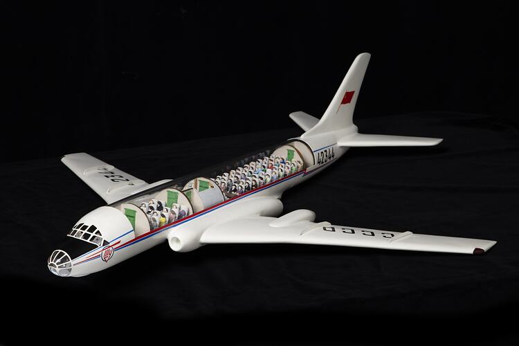 Model of the Tupolev Tu-104 aeroplane, made to 1:35 scale, with sectioned fuselage.