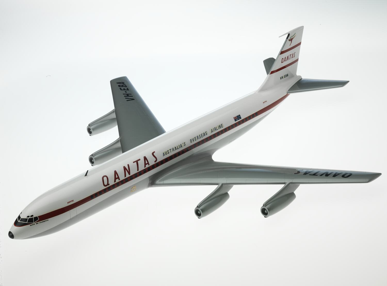 1:72 scale model of a Qantas Empire Airways Boeing 707-138, made for the Museum by Mr B.D Hede. It was received in 1959, shortly after the first QEA 707's were delivered to Australia.