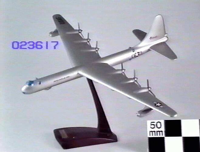 This model of a Convair B-36D was presented to the Museum by Colonel J.L Sullivan in 1954. According to an Australian War Memorial photograph (MALTA0028), a Colonel Sullivan was the Air Attache with the US Embassy in the early 1950s and this officer may have been the source of the donation. It is mounted on a wooden display stand and appears to be a presentation model used by the manufacturer or the USAF as a promotional or display model. It is painted in an all-silver USAF scheme.