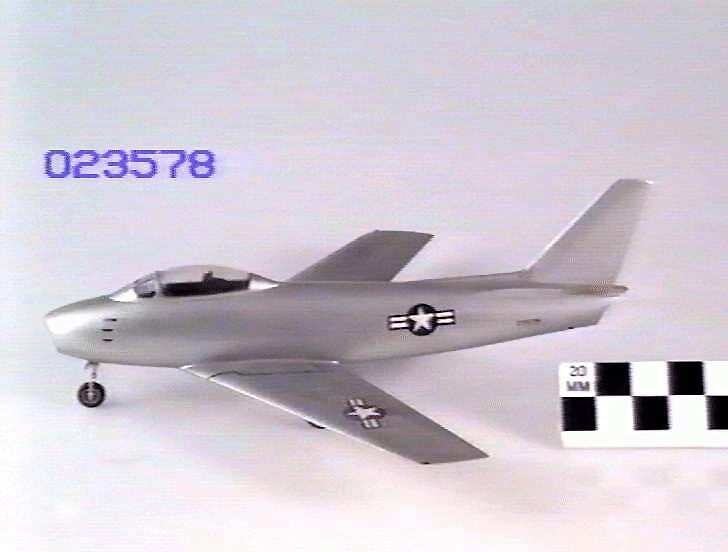 1:32 scale model was commissioned by the Museum and was built by Harold P. Wood in 1953. It was part of a group of Korean War aircraft commissioned by the Museum. This model appears to represent the F-86E version of the Sabre which served with the United States Air Force in Korea.
