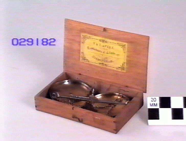 DIMENSIONS OF BALANCE SCALES GIVEN ABOVE, DIAMETER RELATES TO SIZE OF PANS; DIMENSIONS OF BOX 18 cm L x 10.5 cm W x 3 cm H.