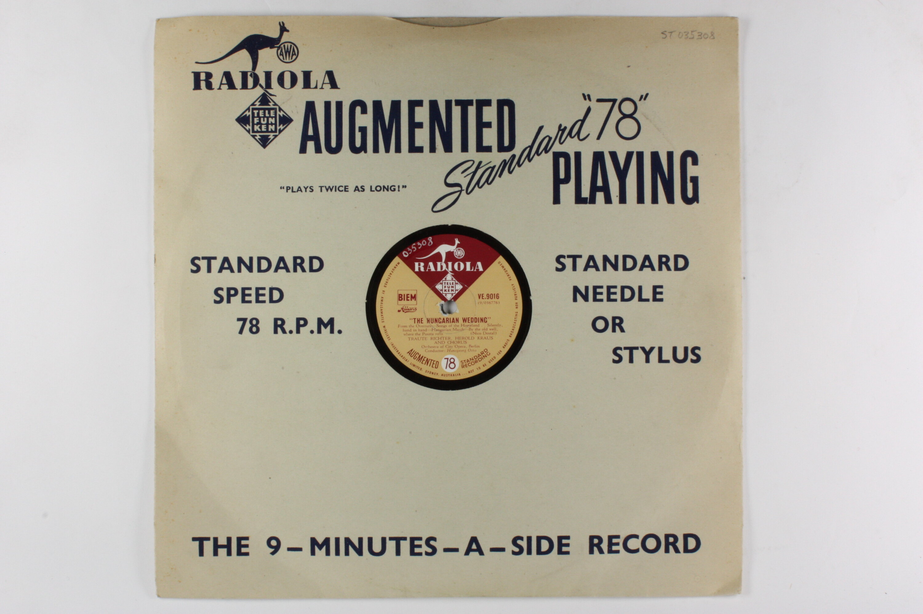 Side A: AWA RADIOLA / VE.9016 / (9/036776) / "THE HUNGARIAN WEDDING" / From the Overture - Songs of the Homeland. / Silently, hand in hand - Hungarian March - By the old well, / where the Puszta rolls / (Nico Dostal) / TRAUTE RICHTER, HEROLD KRAUS AND CHORUS / Orchestra of City Opera, Berlin / Conductor: Hansgeorg Otto / Augmented 78 Standard Recording Side B: AWA RADIOLA / VE.9016 / (9/036777) / "THE HUNGARIAN WEDDING" / Tell me it's true - show me thy beauty, O beloved. / Little Etelka. Now she has gone - Czardas / (Nico Dostal) / TRAUTE RICHTER, HEROLD KRAUS AND CHORUS / Orchestra of City Opera, Berlin / Conductor: Hansgeorg Otto / Augmented 78 Standard Recording / One side of sleeve: (text) Second side of sleeve: (text)