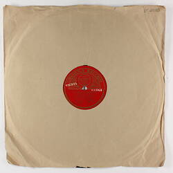 Black disc record with hole in centre of label, in paper sleeve; red and gold label.