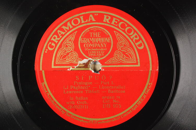 TYPE: GRAMOLA, 12 IN., 78 R. P.M. CONTENTS: "UN NIDO DE MEMORIE" FROM "IL PAGLIACCI" PARTS 1 AND 2, SUNG BY LAWRENCE TIBBETT. COMPANY: THE GRAMOPHONE COMPANY, CZECHOSLOVAKIA. COMPANY CATALOGUE NUMBER: DB975 TYPE DETAILS: DOUBLE SIDED, RED AND GOLD LABEL. COMMENTS: UNUSUAL EUROPEAN PRESSING OF AN AMERICAN RECORDING.