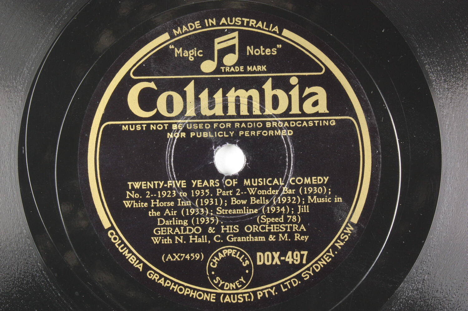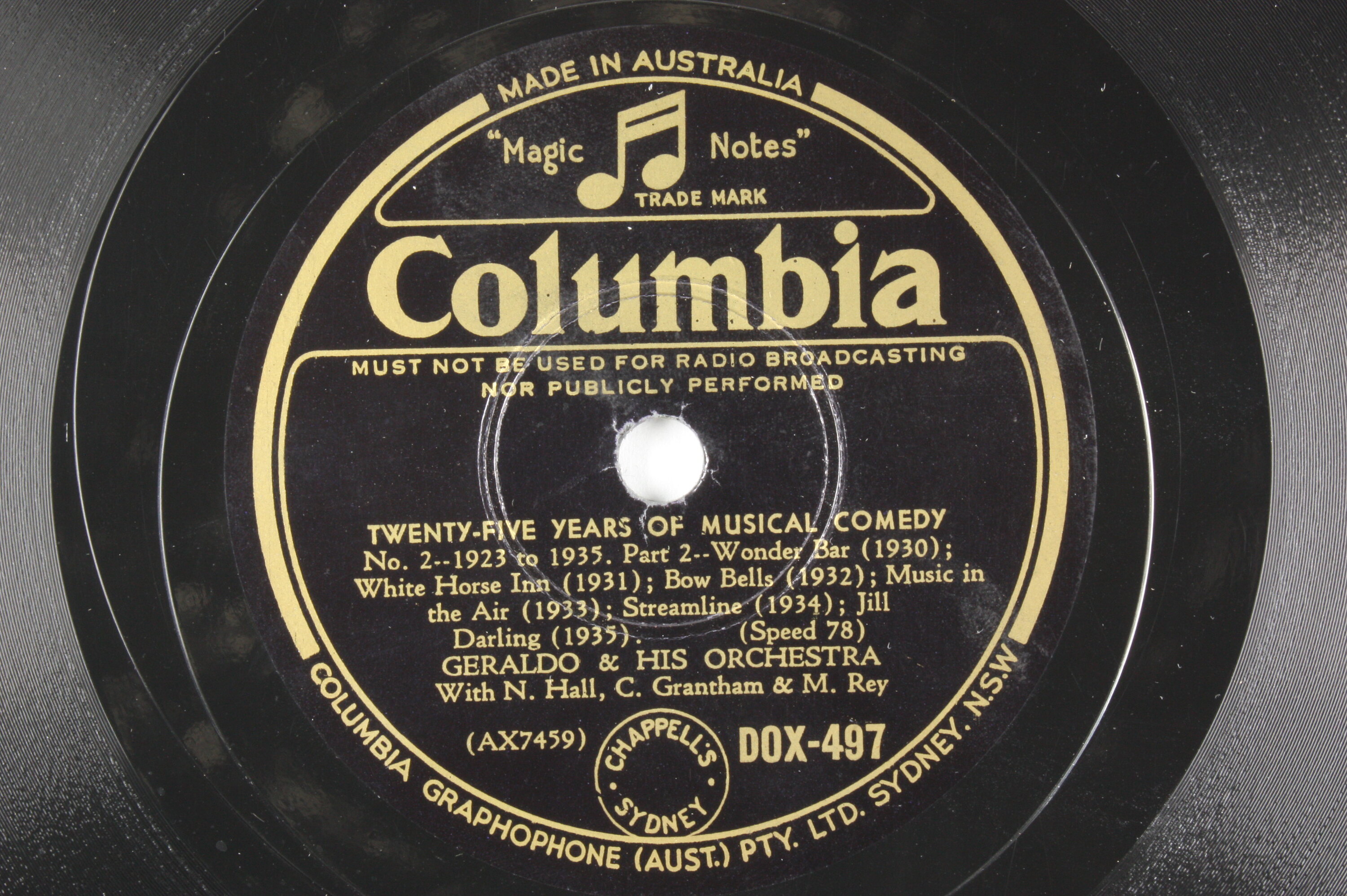TYPE: COLUMBIA, 12 IN., 78 R. P.M. CONTENTS: "TWENTY FIVE YEARS OF MUSICAL COMEDY, PARTS 1 AND 2" PLAYED BY GERALDO'S ORCHESTRA. COMPANY: COLUMBIA, ENGLAND. COMPANY CATALOGUE NUMBER: DOX497 TYPE DETAILS: DOUBLE SIDED, BLACK AND GOLD LABEL.