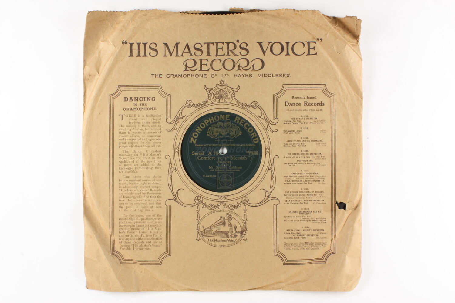 TYPE: ZONOPHONE 12 IN. CONTENTS: "EVERY VALLEY" AND "COMFORT YE" (MESSIAH) BY HANDEL. SUNG BY MR. SYDNEY COLTHAM. COMPANY: BRITISH ZONOPHONE CO. LTD., ENGLAND. TYPE DETAILS: DOUBLE SIDED. COMMENTS: SERIAL NO. A184. MATRIX NOS. Z- 042091 AND AL 8381. REG. TRADE MARK OF RECORD "THE TWIN".